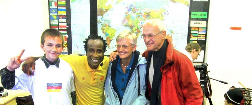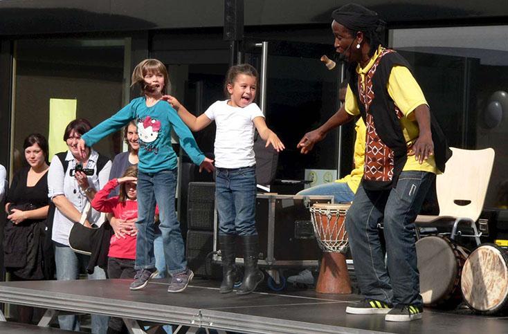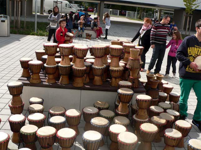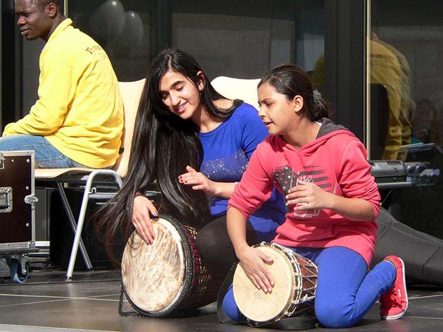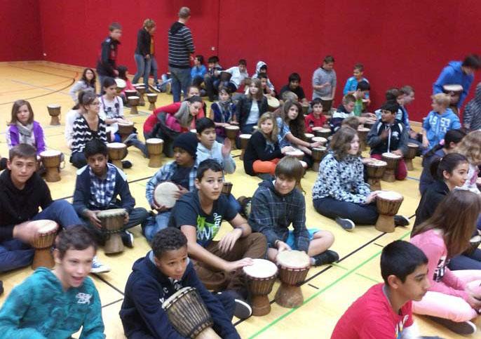 Projektziel: Der Aktionstag soll das Gemeinschaftsgefühl zwischen Regelklassen und Übergangsklassen stärken. Sprachliche, soziale und kulturelle Barrieren werden durch gemeinsames Trommeln, Singen und Tanzen überwunden. Die einzelnen Phasen des Einstudierens dienen als Basis einer intensiven Sprachförderung.